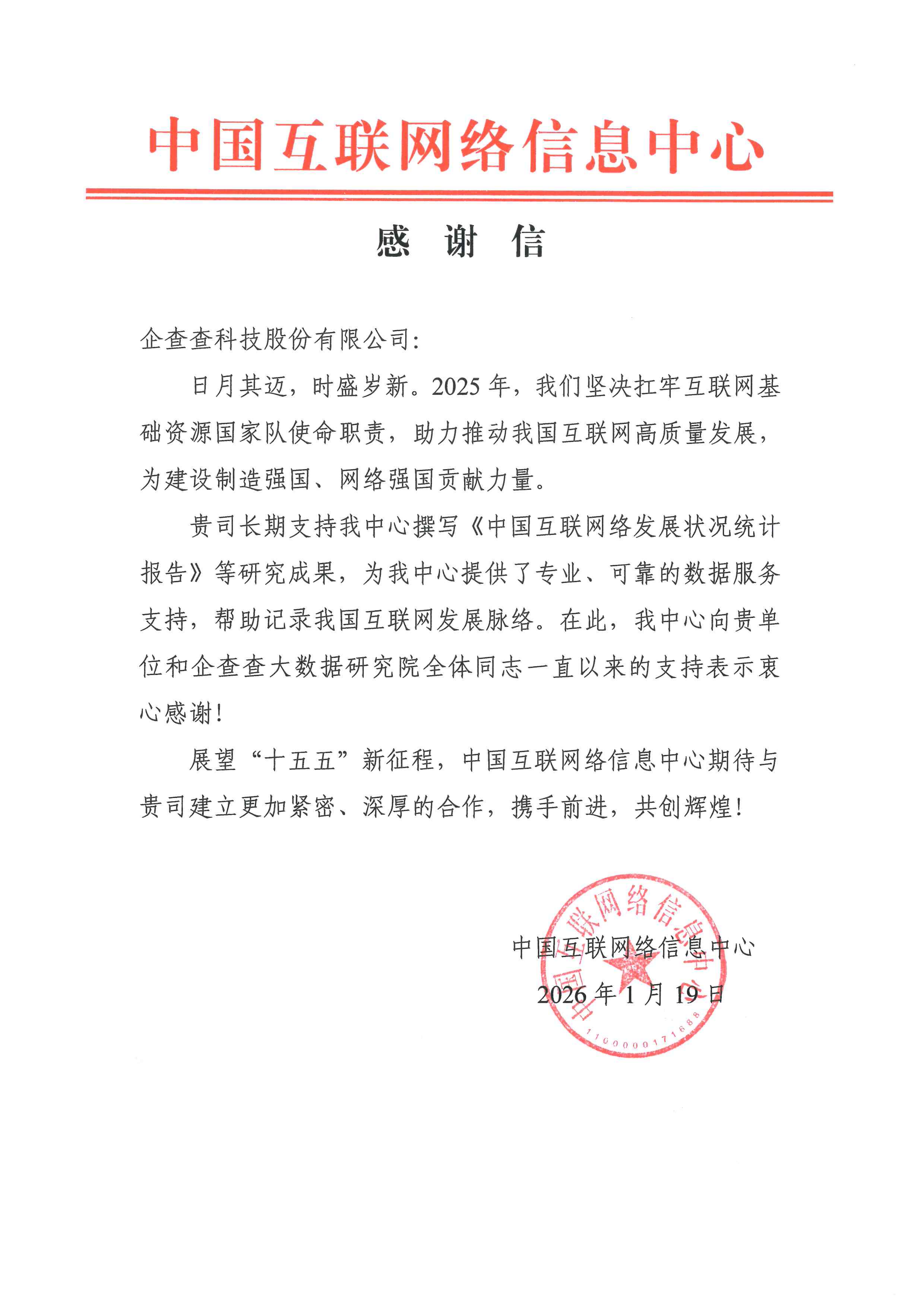 信中对企查查大数据研究院在中国互联网络信息中心的《中国互联网发展状况统计报告》等研究成果中,为其提供专业、可靠的数据服务支持,帮助记录我国互联网发展脉络,表示高度认可和衷心感谢。